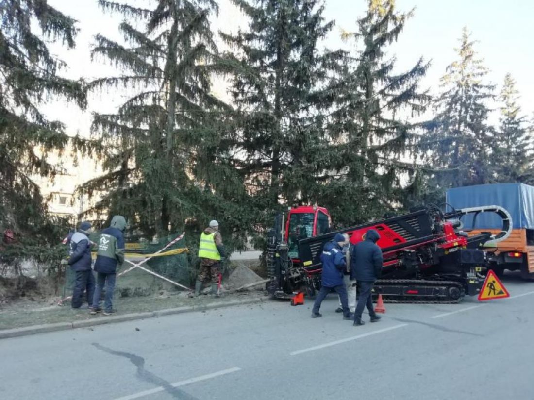 С помощью специальной установки рабочие сделали прокол для устройства газоснабжения - этот метод позволил избежать разрушительного воздействия земляных работ на наземную инфраструктуру.