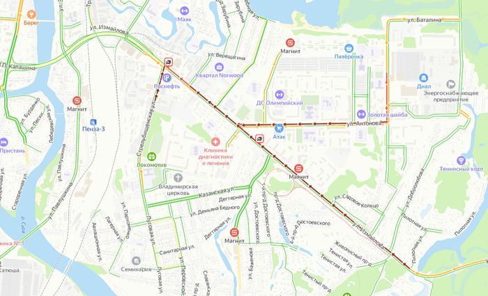 Об огромном заторе сообщает оказавшийся в нем журналист портала «Пенза-Взгляд». По его словам, автомобили, пытающиеся двигаться по направлению к центру города, вынуждены останавливаться еще в районе торгового центра «Семейный».