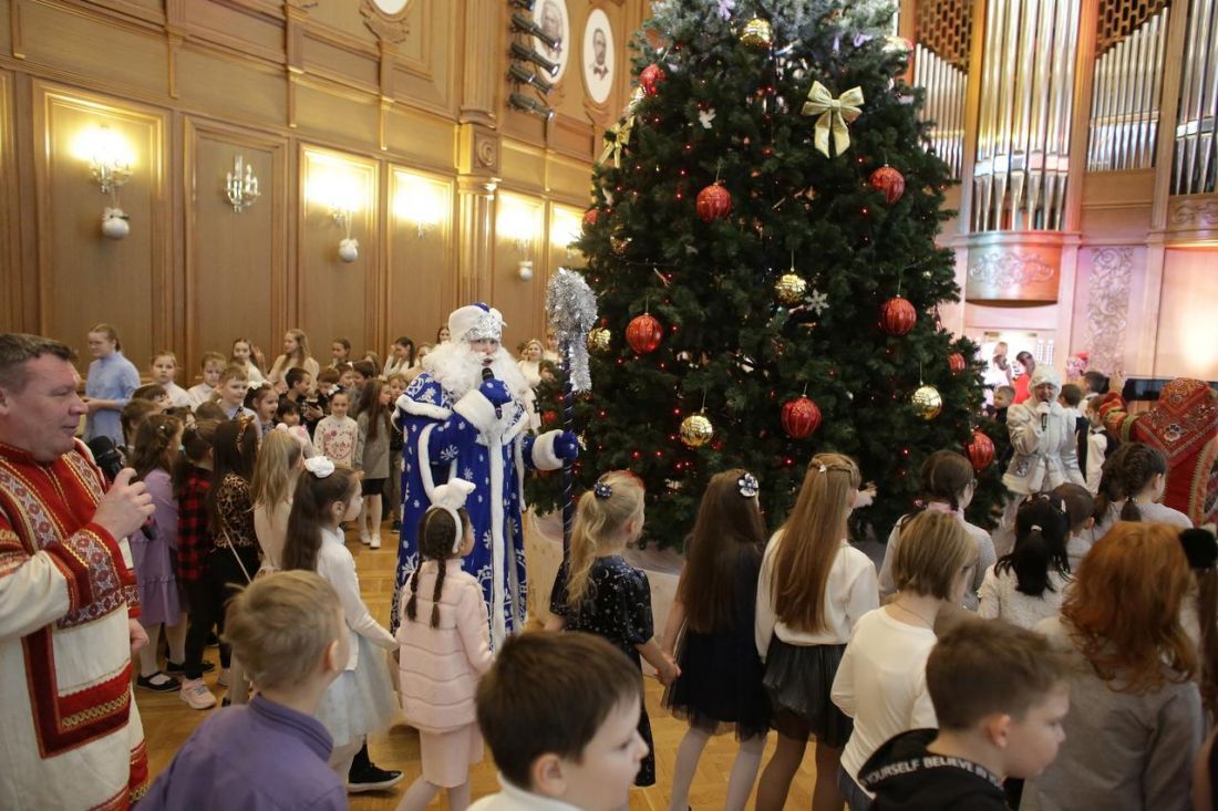 В Органном зале филармонии Дед Мороз и Снегурочка позвали детей в хоровод. Для малышей выступали артисты ансамбля русской этнической музыки «Миряне» и солистка «Пензаконцерта» Софья Семьянова (орган).