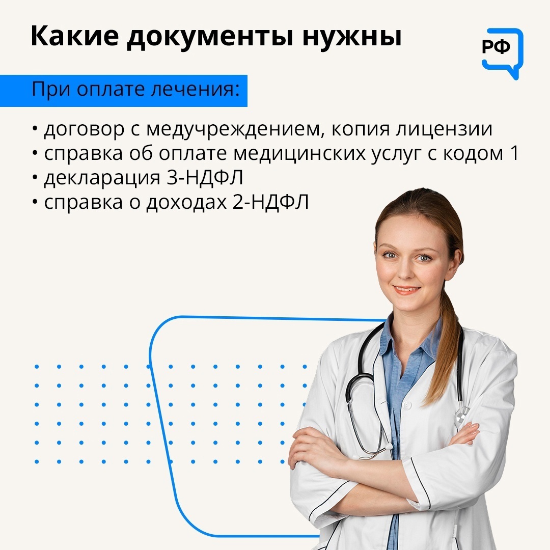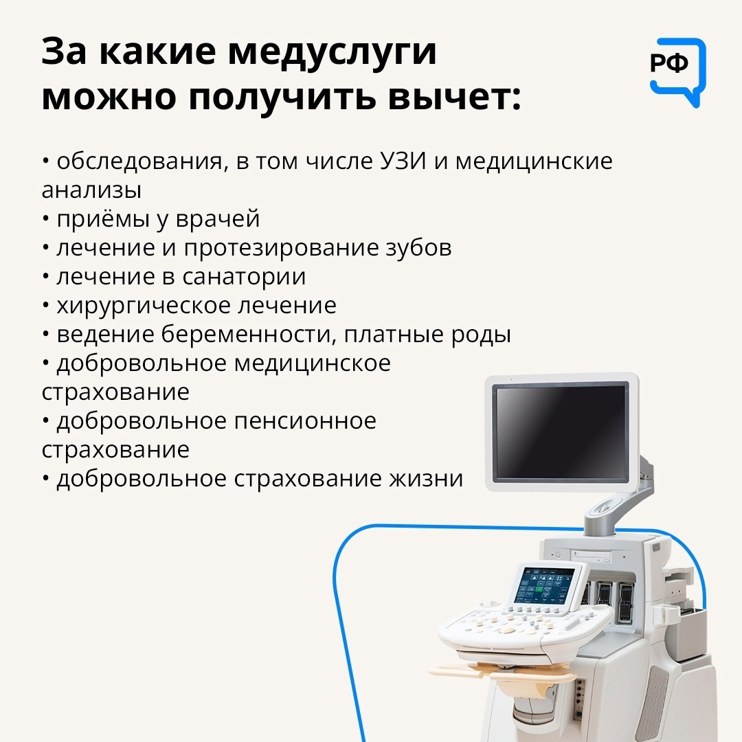 Специалисты портала «Объясняем.рф» сообщили, за какие услуги можно получить налоговый вычет. Среди них оказались обследования, приемы у врачей, лечение и протезирование зубов, хирургическое лечение. Подробнее в карточке: