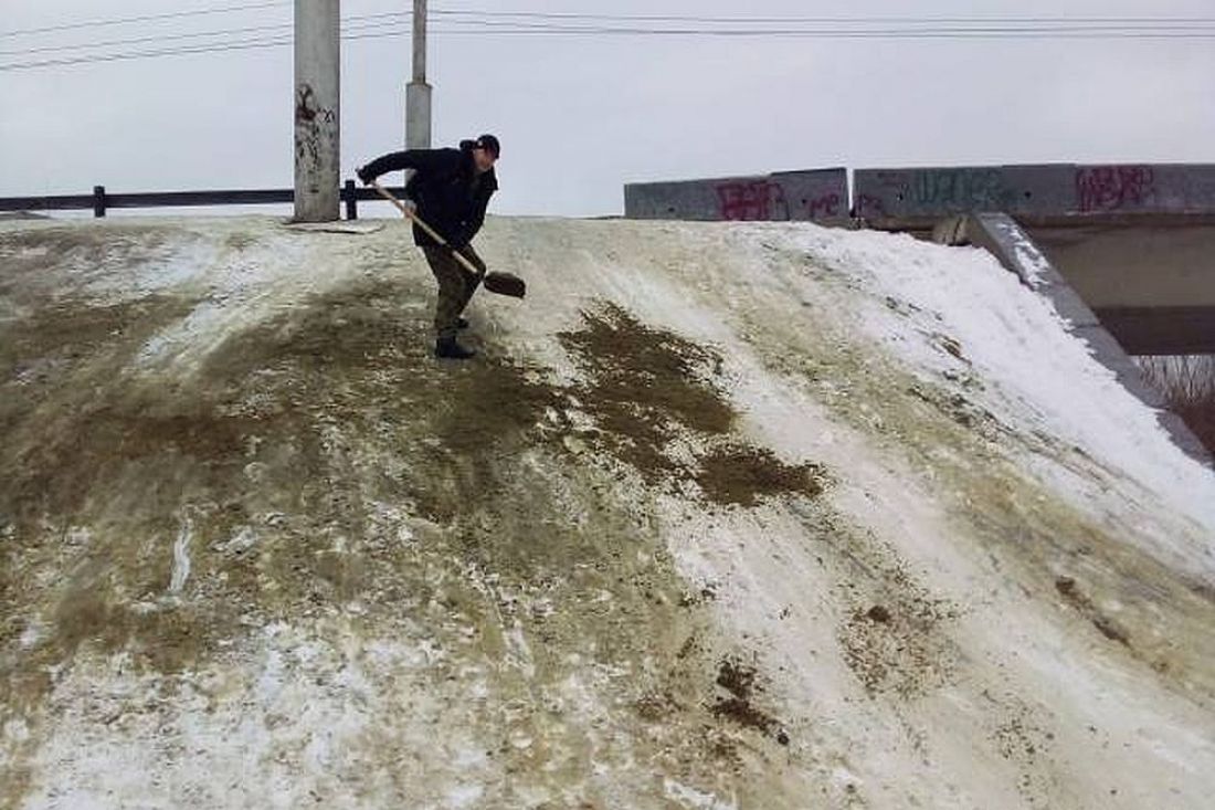 Как сообщает пресс-служба мэрии, 16 января сотрудники администрации Октябрьского района с привлечением представителей общественности обработали пескосоляной смесью раскатанный на склонах Беляевского путепровода спуск.