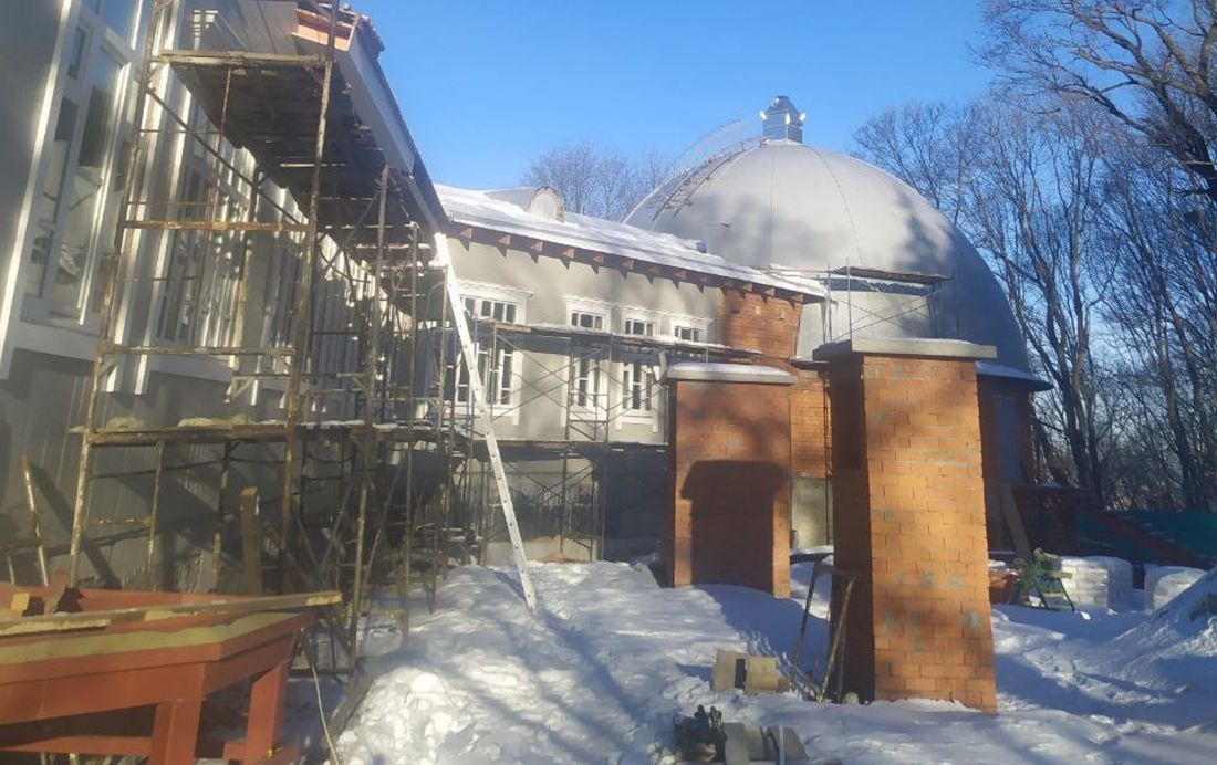 Сейчас специалисты занимаются устройством фасада, монтажом подвесного потолка подвала, прокладкой систем электроснабжения и вентиляции, слаботочных систем, а также устройством утепления кровли купола и оштукатуриванием стен на первом этаже.