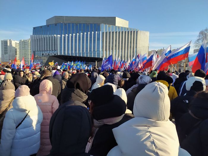 На площади собрались порядка шести тысяч жителей, которые, невзирая на разгар буднего дня и занятость, пришли поддержать солдат и офицеров, участвующих в специальной военной операции.