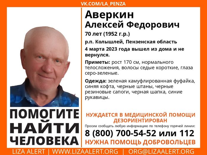 Поисковый отряд «Лиза Алерт Пенза» сообщил о подготовке выезда волонтеров, чтобы попробовать найти 70-летнего Алексея Аверкина. Он вышел из дома 4 марта и не вернулся.