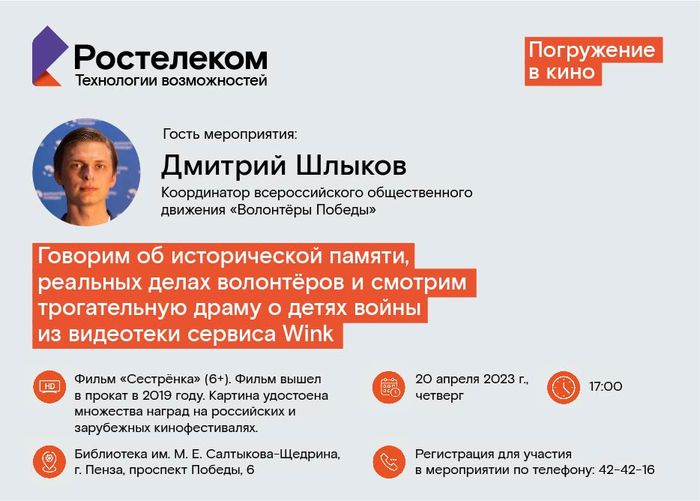 Специальным гостем на кинопоказе станет координатор всероссийского общественного движения «Волонтёры Победы» Дмитрий Шлыков. Он расскажет о работе организации и реальных делах участников движения.