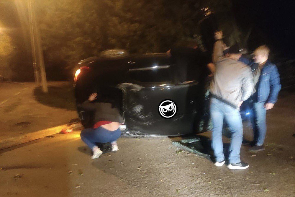 Видно, что легковая машина находится у края дороги, рядом с бордюром. Транспортное средство перевернуто на бок, у него смята крыша и выбиты стекла. Сведений о пострадавших не поступало.