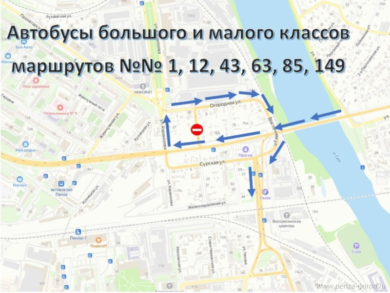 По данным пресс-службы администрации Пензы, с 30 июня по 6 июля автобусы большого и малого классов вместимости под номерами: 1, 12, 43, 63, 85, 149 временно изменят свой обычный маршрут.