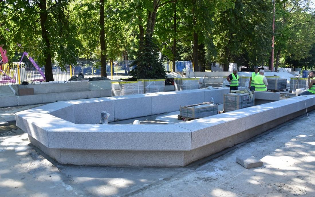 Территория вокруг фонтана укладывается плиткой. В парке установят скамейки, гранитные клумбы, посадят цветы. Самой непростой задачей является монтаж входной группы.