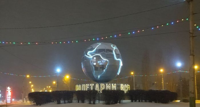 С ее помощью выделены контуры материков, а рядом с моделью земного шара теперь светится надпись «Пролетарии всех стран соединяйтесь», в которой, как заметили горожане, пока не хватает запятой.