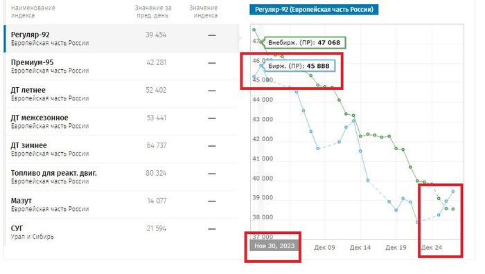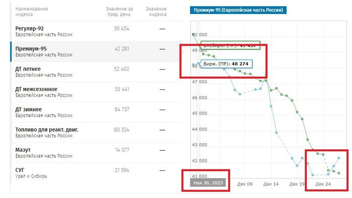 Согласно биржевым показателям, с конца ноября стоимость тонны бензина популярных марок АИ-92 составляла около 46 тысяч рублей, а АИ-95 - более 48 тысяч рублей.