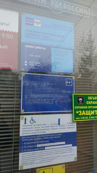 Как сообщает Meduza, у входа в одно из отделений «Почты России» в городе Конаково Тверской области повесили табличку с адресом и расписанием работы, написанную шрифтом Брайля. Однако прочесть информацию вряд ли получилось у тех, кто является инвалидом по зрению, - доску с рельефной надписью повесили под стекло. Фотофакт появился в «Твиттере» пользователя Devyatov.