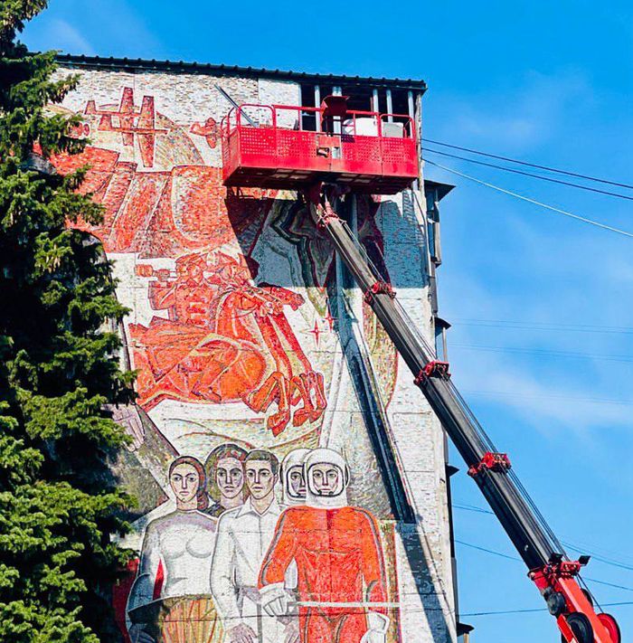 «На пустующих участках мозаичного панно установили восемь панелей общей площадью около шести квадратных метров», - отметил градоначальник и опубликовал фотографии обновленной стены дома.