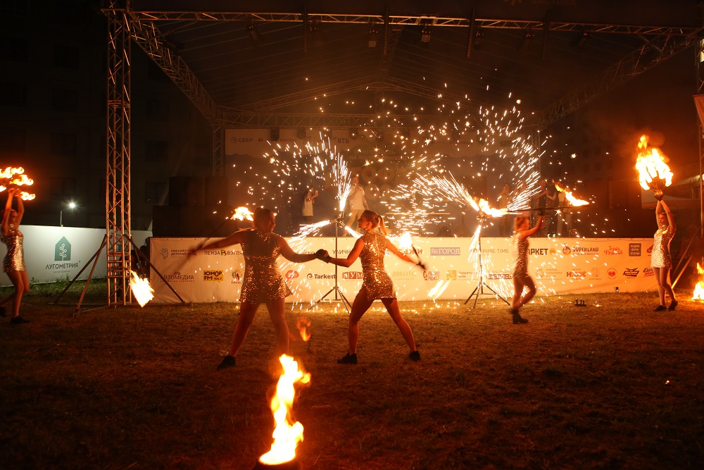 А когда настал вечер, все гости увидели яркое фаер-шоу. Горящие фигуры, умелые движения с факелами и огнями стали яркой точкой, завершившей насыщенный день «Лугофеста».