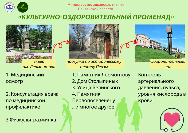 Мероприятие начнется в сквере имени М. Ю. Лермонтова в 16:00. Участники проекта сделают гимнастику, пройдут комплексное медицинское обследование. Далее желающие отправятся на прогулку по историческому центру Пензы — сотрудник библиотеки проведет познавательную экскурсию.