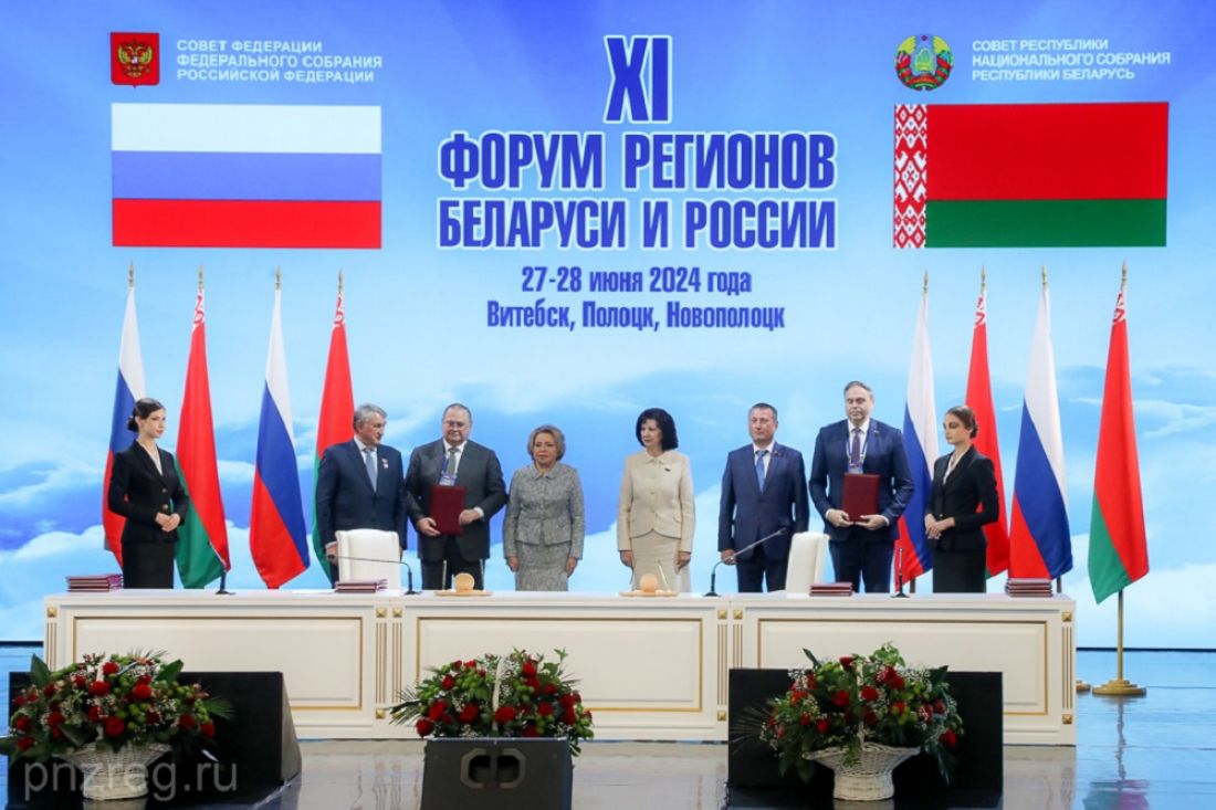 На пленарном заседании 11-го Форума регионов Беларуси и России в присутствии председателей верхних палат парламентов государств Натальи Кочановой и Валентины Матвиенко стороны подписали соглашение о сотрудничестве.