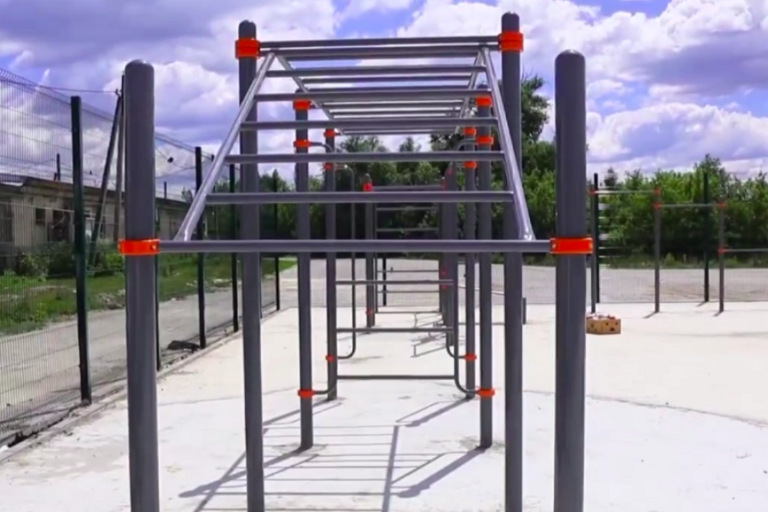 Подрядная организация уже установила турники, гимнастические скамьи, шведскую стенку.