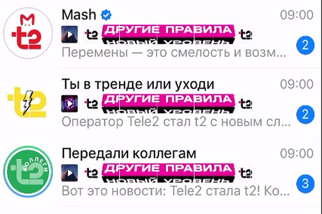 4 сентября Tele2 представила новое лого, сменила название на T2 и перезапустила рекламную кампанию под слоганом «Другие правила. Новый уровень». Тем самым оператор напрямую сообщил цифровой аудитории о ребрендинге. В 9:00 по московскому времени кобрендированные аватарки распространились по всему Telegram и были закреплены на 24 часа.