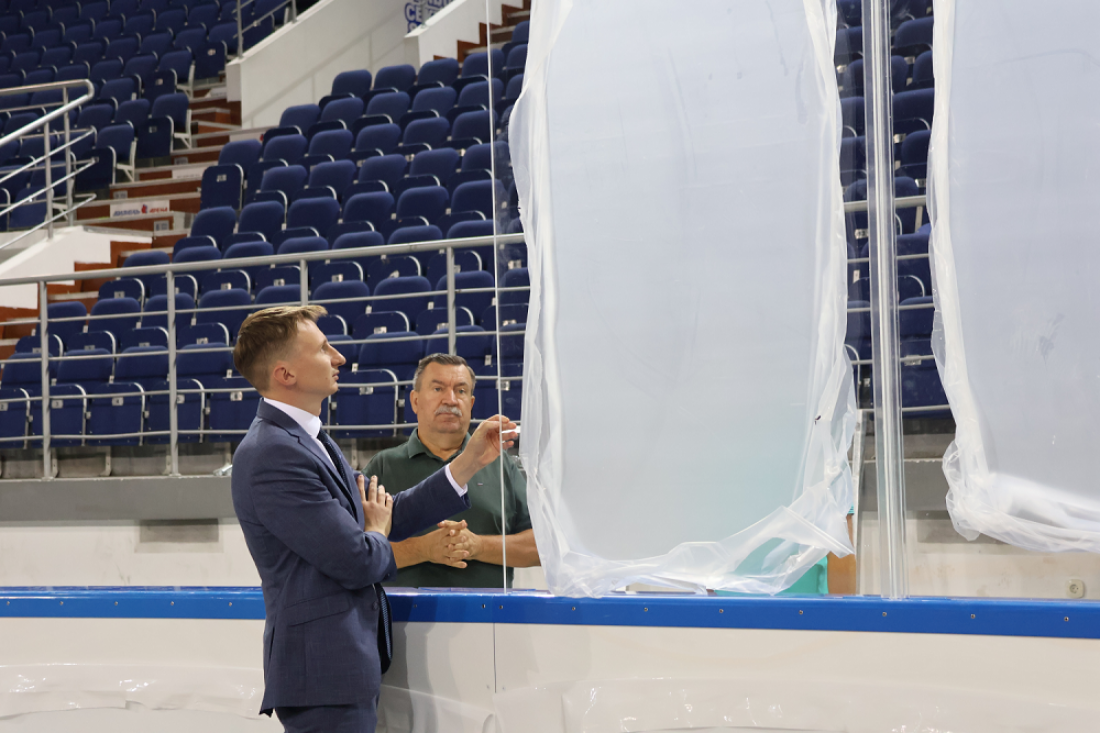 На сегодняшний день уже установлены новые хоккейные борта, выставлены защитные акриловые стекла. Подрядной организации осталось подготовить отсеки для игроков и судей.