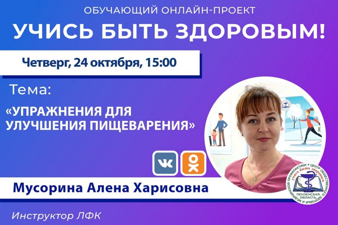 Завтра, 24 октября, в рамках онлайн-проекта «Учись быть здоровым!» инструктор по лечебной физкультуре Алена Мусорина проведет прямой эфир на тему: «Упражнения для улучшения пищеварения». Начало трансляции запланировано на 15:00, сообщается в телеграм-канале Пензенского центра общественного здоровья и медицинской профилактики.