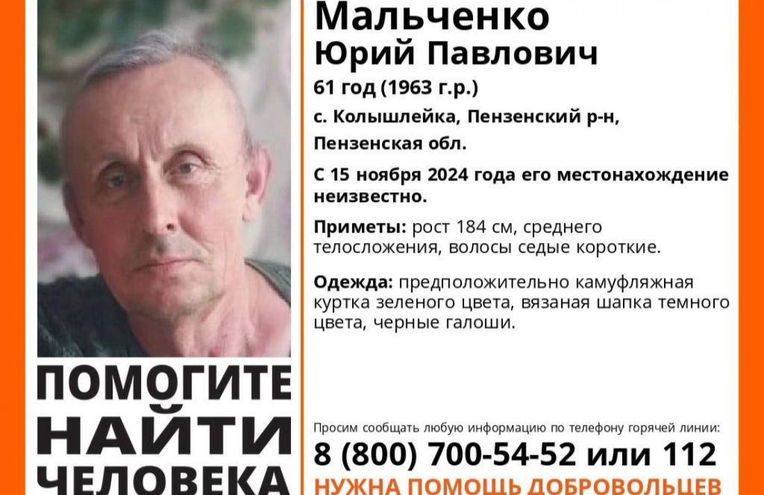 61-летний Юрий Мальченко, проживающий в селе Колышлейка Пензенского района, пропал 15 ноября. С этого дня его местонахождение неизвестно.