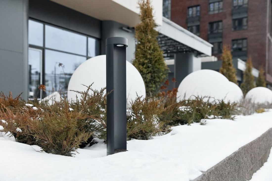 Вечером атмосферы добавляет стильное многоуровневое освещение в виде шаров, наклонных столбиков среднего размера и высоких фонарей, а также архитектурная подсветка здания в теплом белом оттенке.