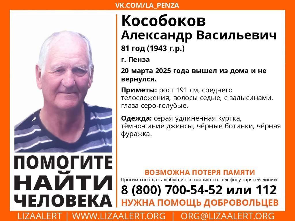 Информация об исчезновении Александра Кособокова 1943 года рождения появилась в телеграм-канале «ЛизаАлерт Пенза». Волонтеры сообщили, что пожилой человек 20 марта вышел из дома и не вернулся. Ситуация осложнена тем, что у мужчины возможна потеря памяти.