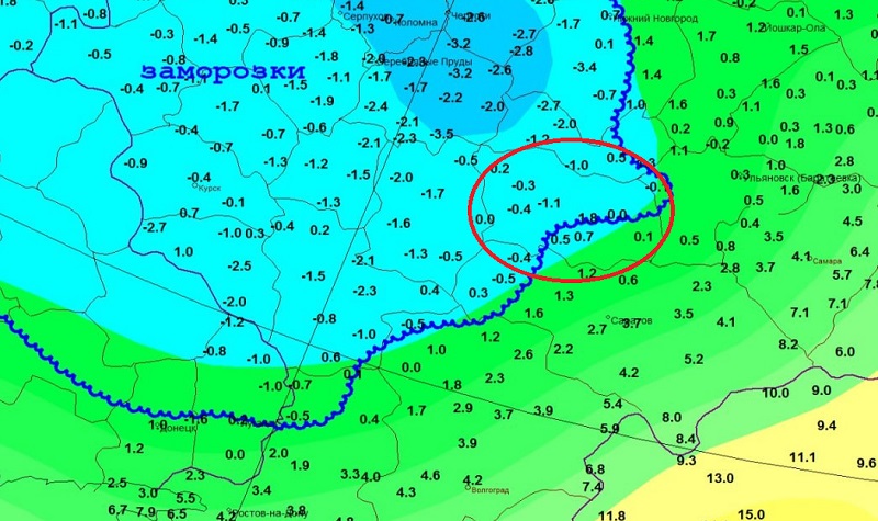 Сегодня, 27 апреля, отрицательные температуры наблюдались даже в Южном федеральном округе. Теперь граница заморозков проходит по территориям Донецкой и Луганской республик, по северным районам Ростовской, Волгоградской, Саратовской, Ульяновской областей и далее на северо-восток.