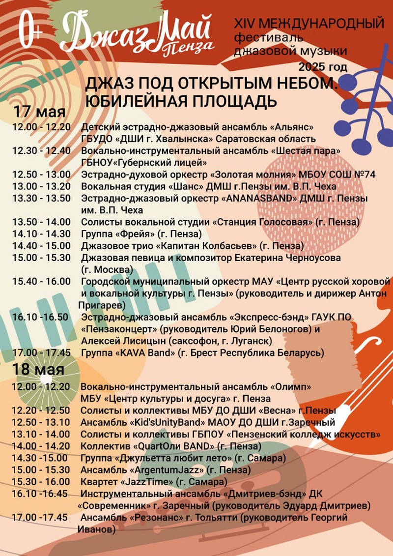 Основной площадкой фестиваля станет Юбилейная площадь. С 12:00 до 18:00 здесь выступят музыканты из детских школ искусств Пензы и Хвалынска Саратовской области, Пензенского колледжа искусств. На сцену выйдут джазовые коллективы из Пензы, Заречного, Самары, Тольятти, Белгорода, а также из Республики Беларусь и Казахстана (Алматы). Выступят и музыканты из Москвы и Луганска, сообщает пресс-служба правительства Пензенской области.