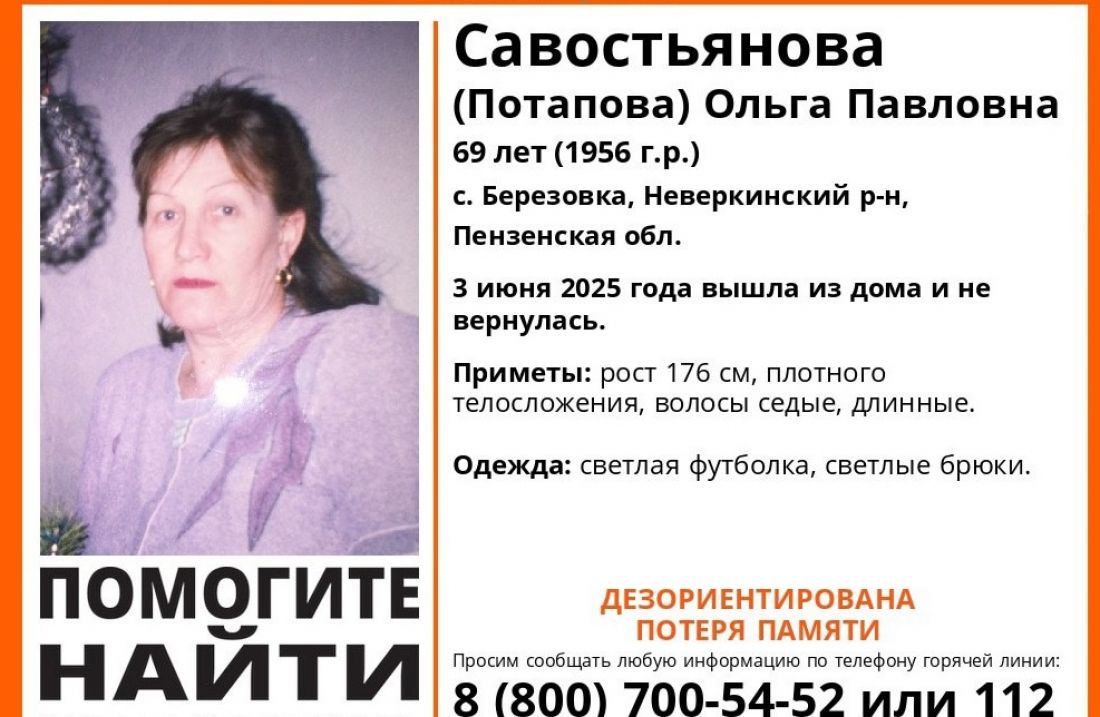 В телеграм-канале поискового отряда «Лиза Алерт» опубликованы приметы пропавшей: рост 176 см, плотного телосложения, волосы седые, длинные. Сообщается, что женщина дезориентирована, у нее потеря памяти.