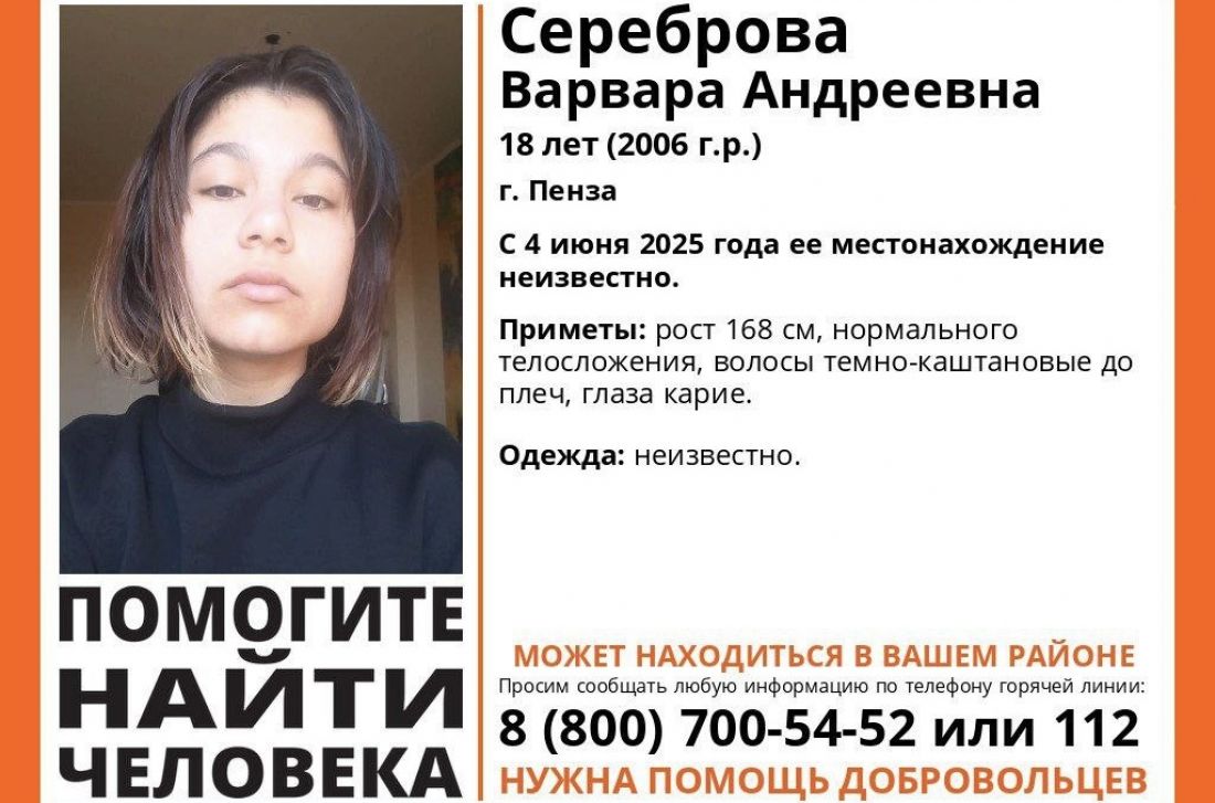 Как сообщили представители поискового отряда «ЛизаАлерт Пенза» в своем официальном телеграм-канале, с 4 июня текущего года местоположение 18-летней Серебровой Варвары Андреевны, проживающей в областном центре, остается неизвестным.