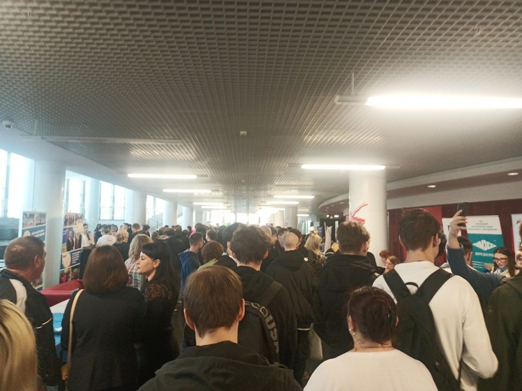 На этажах киноконцертного зала развернулись стенды компаний, к которым посетители подходили, чтобы получить информацию об имеющихся рабочих местах, зарплатах и условиях труда.