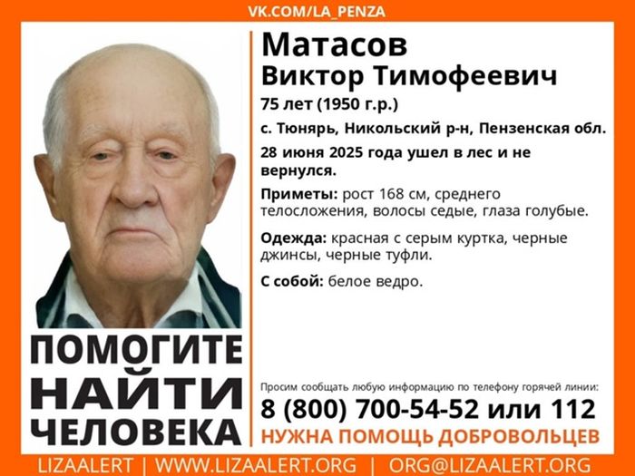Представители поискового отряда «Лиза Алерт Пенза» сообщили в соцсетях, что пенсионер 28 июня ушел из дома в селе Тюнярь в лес и не вернулся. Они добавляют, что с собой у него было белое ведро.