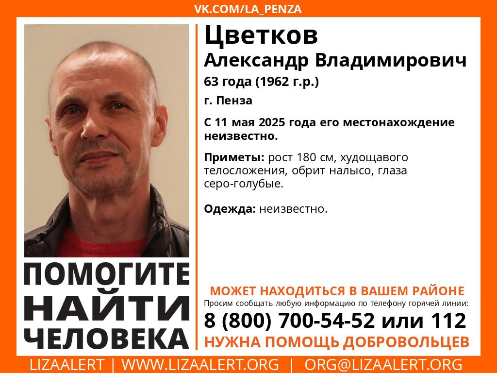 Как сообщили представители поискового отряда «ЛизаАлерт Пенза» в своем официальном телеграм-канале, Александр Цветков пропал 11 мая текущего года. В настоящее время о его местонахождении информации нет.