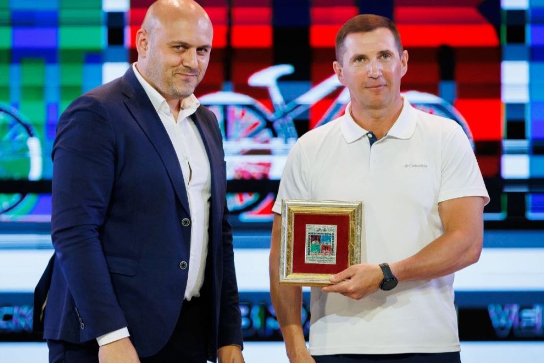 Кучерявый вручил президенту областной федерации Максиму Чернышову сертификат на 20 велосипедов для юных спортсменов.