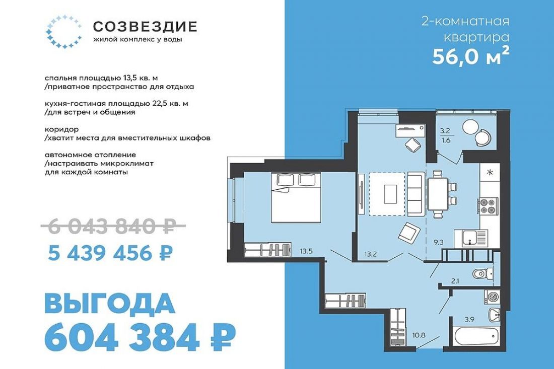 2-комнатная евро в «Созвездии» с выгодой 600 тыс. рублей