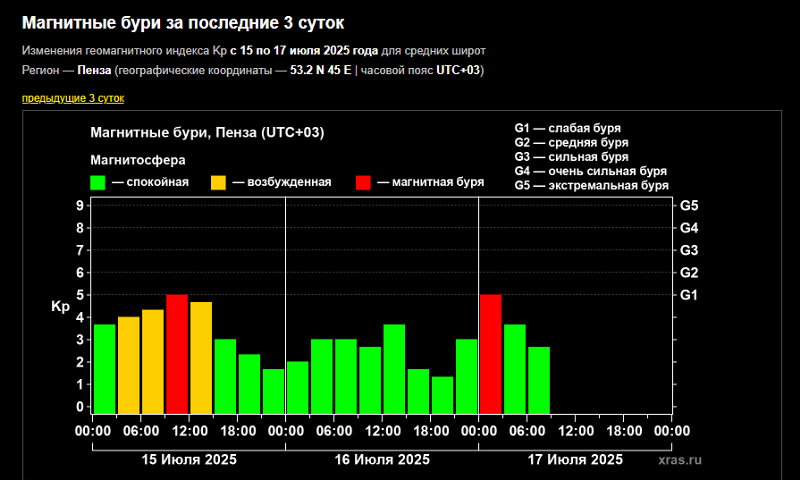 Слабая магнитная буря уровня G1 произошла 17 июля в Пензенской области.