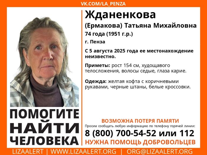 Волонтеры поискового отряда «Лиза Алерт» распространили информацию о пропаже 74-летней пензячки Татьяны Жданенковой (Ермаковой).