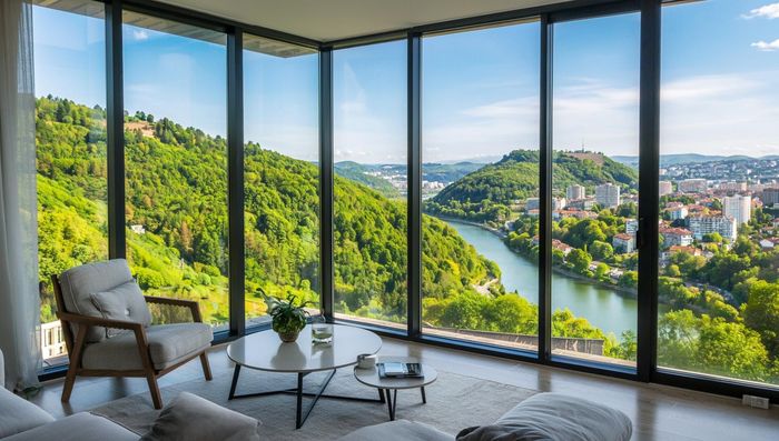 Промт для идеальной картинки «квартиры будущего» от Kandinsky: Вид из панорамного окна современной квартиры в Пензе, Россия. Летний день. На переднем плане – зеленые холмы, покрытые смешанным лесом (лиственные и хвойные деревья). В долине между холмами видна извилистая река (Сура или приток). На заднем плане – утопающие в зелени кварталы города. Яркая зелень, солнечно. Стиль: Реализм, умиротворяюще, атмосферно, продающее. Внутри квартиры – теплый дневной свет.