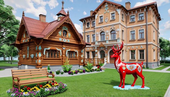 Промт для Kandinsky: Пешеходная зона в центре Пензы, Россия. Сохраненные старые дома (классические, деревянные). В глубине двора – новый современный корпус (3 этажа) с классическими пропорциями, но с яркими керамическими вставками на фасаде в форме абашевских петушков/оленей. Во дворе – инсталляция из крупных стилизованных игрушек, скамейка с цитатой. Стиль: Яркий реализм, фолк-модерн.