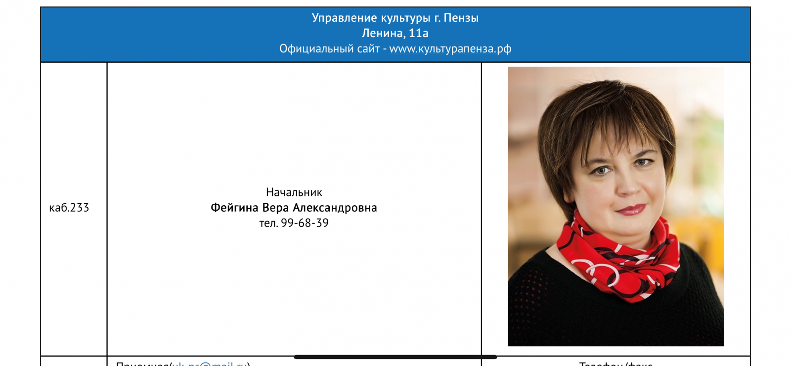 Отмечается, что на сайте администрации Пензы Вера Фейгина по-прежнему указана как действующий начальник управления культуры Пензы.