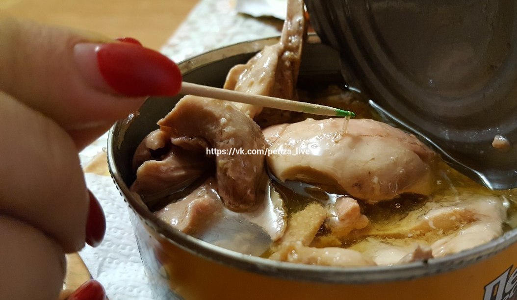 Пост подписчица проиллюстрировала красноречивыми фотографиями, на которых видно, что в банке помимо обещанной печени трески (как написано на этикетке консервов) присутствует ингредиент, о котором ничего не говорится перечне составляющих продукта, – червяки. Одного из них девушка подловила на зубочистку.