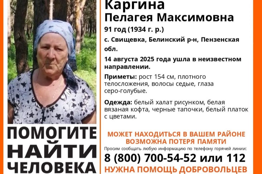 В Белинском районе Пензенской области пропала Пелагея Каргина из села Свищевка.