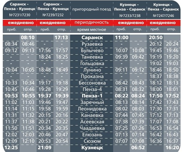 Произойдут изменения в маршрутах следования. Например, утренний электропоезд, следующий из Кузнецка в Саранск, добавит в свой маршрут остановку на станции Танеевка, при этом станция Рузаевка будет исключена из графика его остановок. Вечерние рейсы также будут делать дополнительные остановки на станциях Проказна, Гольцовка и Танеевка.
