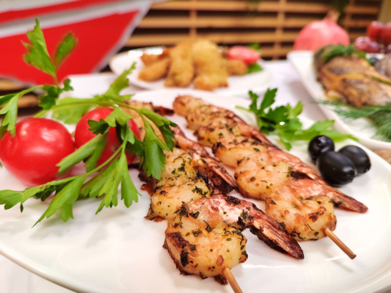 Главным хитом стал шашлык из королевских креветок. В процессе приготовления креветки бережно маринуются в нежном сливочном маринаде с букетом прованских трав, а затем отправляются на мангал. Всего несколько минут на углях — и на столе красуется ароматное блюдо, вкус и вид которого переносят на уютную террасу на побережье Греции или Италии.