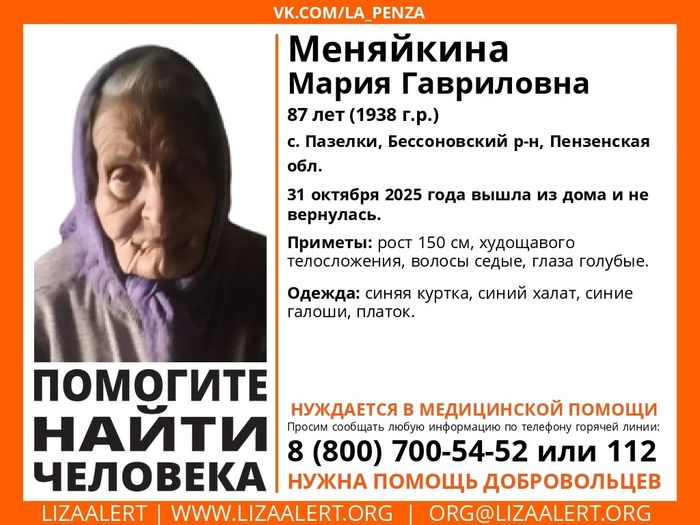 Пензенский поисковый отряд «Лиза Алерт» сообщил об исчезновении 87-летней жительницы села Пазелки Бессоновского района Марии Меняйкиной.