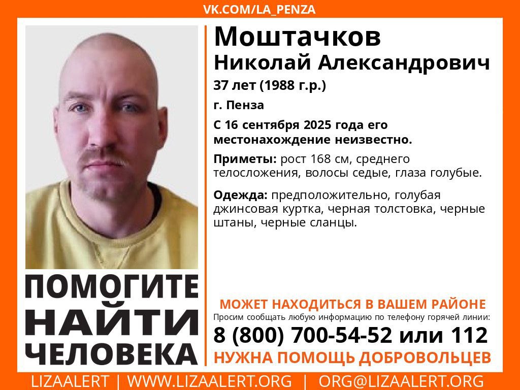 Информация об исчезновении 37-летнего Николая Моштачкова появилась в официальном телеграм-канале поискового отряда «ЛизаАлерт Пенза». Волонтеры сообщили, что с 16 сентября текущего года о местонахождении мужчины 1988 года рождения ничего неизвестно.