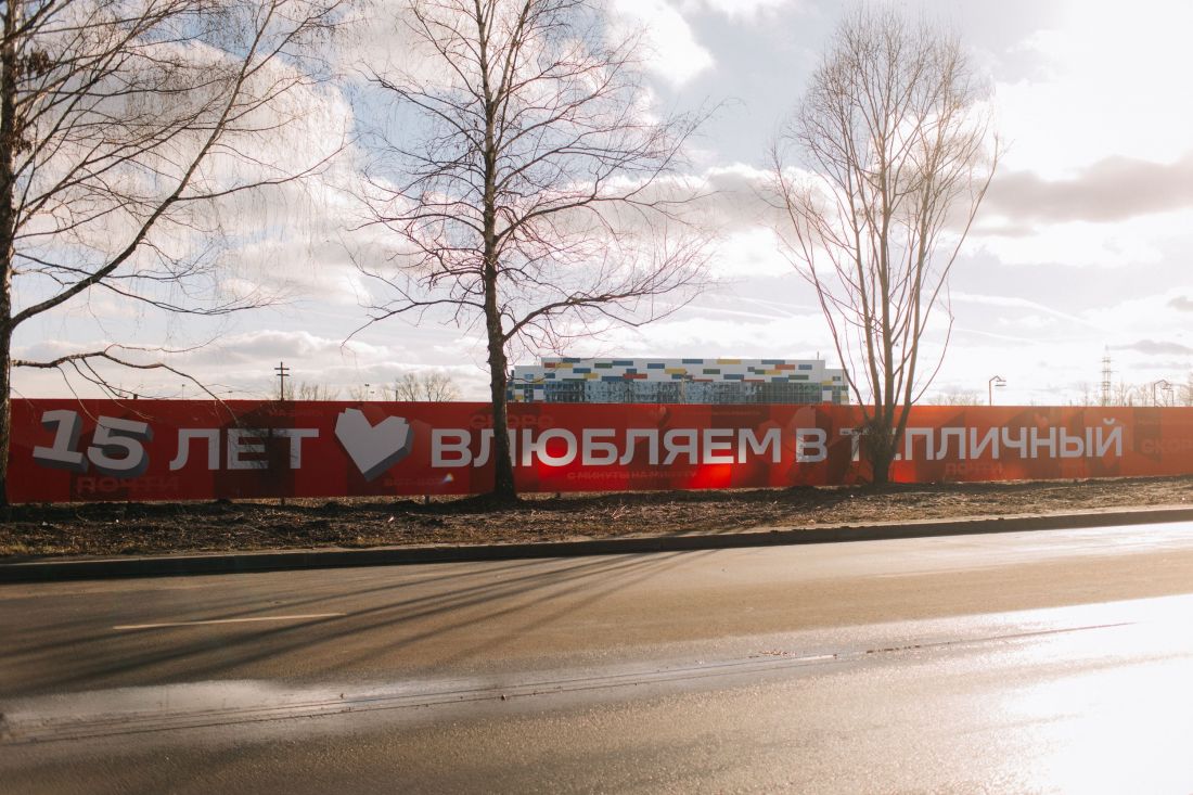 Красный забор с надписью «15 лет влюбляем в Тепличный» и логотипом компании красноречиво говорит о намерении «Рисан» продолжать развивать этот район ещё не один год.