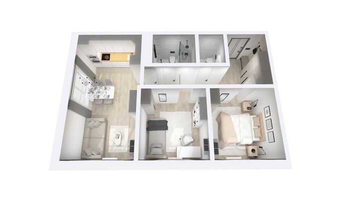 Так, например, 2-спальная квартира площадью 64,6 кв. метра на третьем этаже обойдется в 5,7 млн. рублей. Больше 20 кв. метров в ней приходится на кухню-гостиную, которая станет местом для сбора всей семьи. А в большей спальне предусмотрено увеличенное место под хранение.