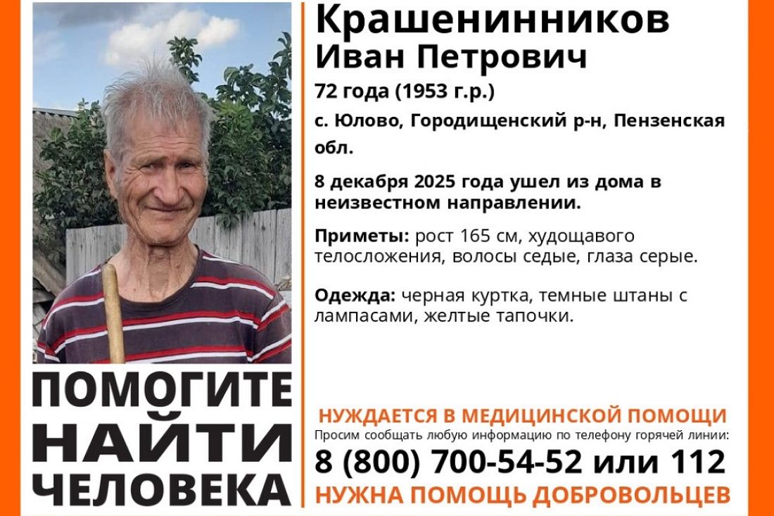 В соцсетях появилась ориентировка на пропавшего жителя Пензенской области. 72-летний житель села Юлово Городищенского района исчез, и сведений о его местонахождении нет с 8 декабря.
