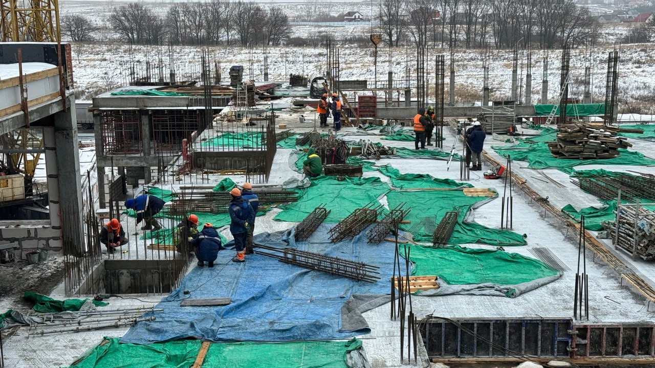 В настоящее время на стройобъекте ведутся монолитные, штукатурные и электромонтажные работы, устройство наружных стен, перегородок, стяжки пола, а также установка оконных конструкций. В подвальном помещении проводятся работы по утеплению.